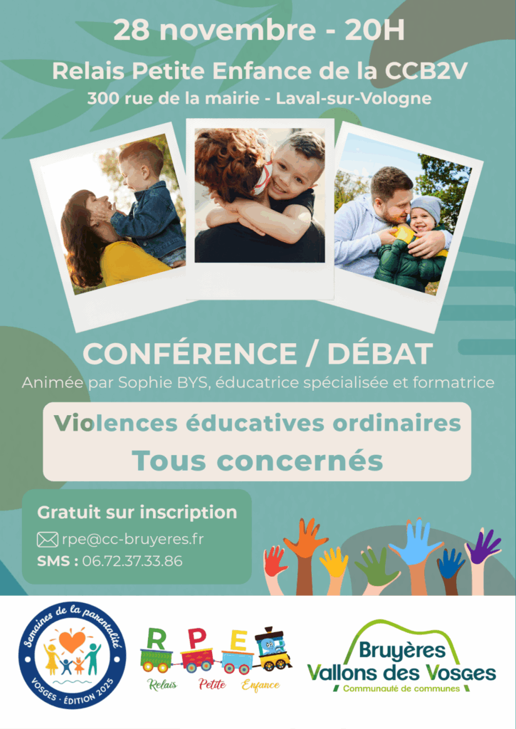 Pour clôturer les Semaines de la Parentalité dans les Vosges, le Relais Petite Enfance de la CCB2V propose une  conférence / débat ouverte à tous. Le thème : Violences éducatives ordinaires, tous concernés.